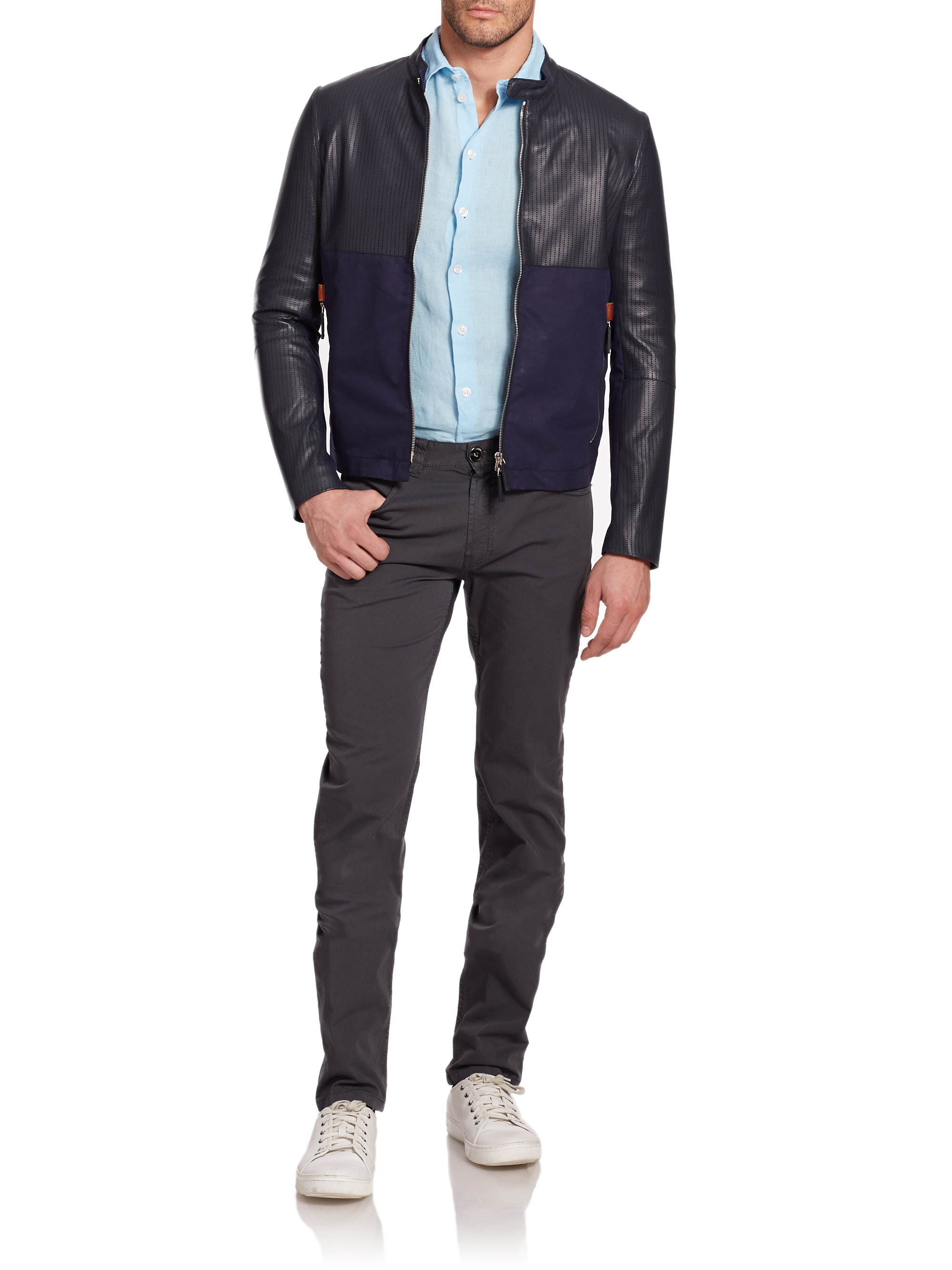 Armani Jeans Perforated Leather Blouson With Jersey Insets In Dark Blue Blue For Men Lyst