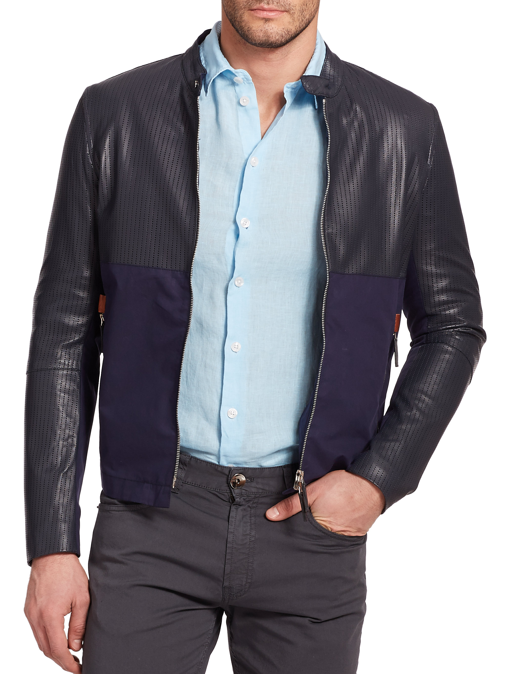 Armani Collezioni Croc Embossed Perforated Leather Jacket Navy Blue 1 495 Neiman Marcus Lookastic
